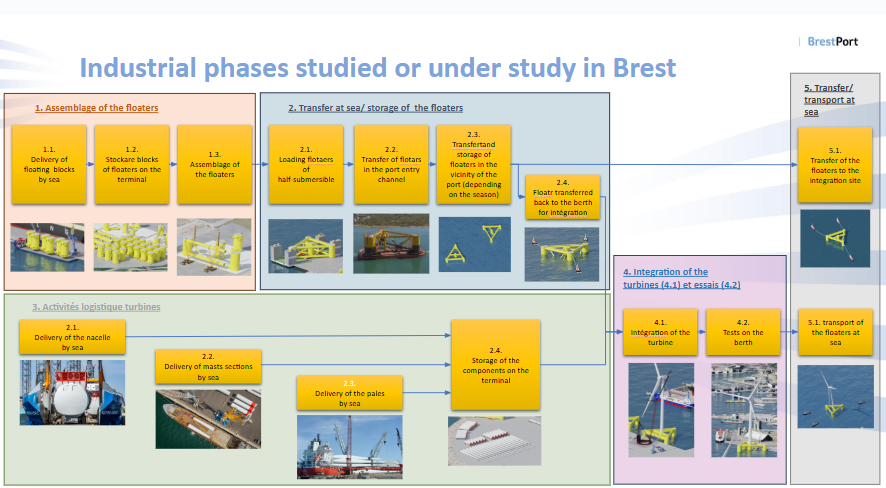 A Working Group was setup, with the captain of BrestPort, the navy and PREMAR (maritime prefecture) in charge of safety/security of the maritime space. A strategic study was realised that takes into account the production/integration of the components and the max storage capacity on/around the terminal to reduce the number of masts/floaters stored at sea. Different maritime storage techniques were studied and different spaces identified to avoid extra risk for maritime trafic in the port channel.