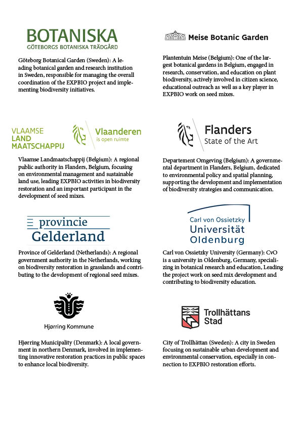 The consortium is composed of eight core partners, including regional public authorities and knowledge partners, each contributing their specialized expertise in biodiversity restoration, seed mix development, and public engagement. The partnership is organized around three key thematic clusters: Restoration Practices, Seed Mix Development, and Education & Engagement, ensuring a comprehensive approach to enhancing plant biodiversity across diverse urban and rural landscapes in the NSR.