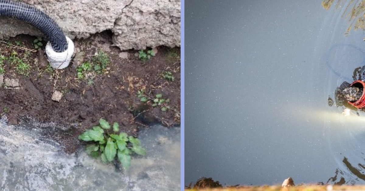 Underwater, the problem was quickly found: the access pipe from the trap to the collection tank was completely clogged with dead crabs. Presumably, the way out to the surface was too difficult for the crabs to climb, so the pipes were modified: the smooth, closed pipes were replaced by ribbed, perforated drainage pipes. In the meantime, the trap itself was also cleaned to remove silt and leaves. Plexiglass plates were installed along the concrete walls to prevent the little climbing champions from bypassing the trap.