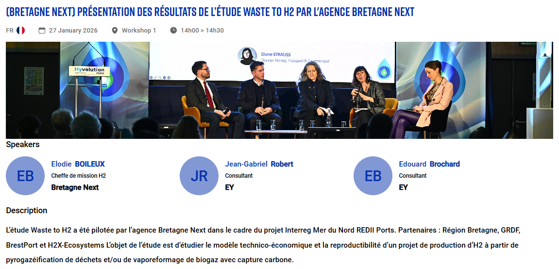During the workshop "Présentation des résultats de l’étude Waste to H2 par l'agence Bretagne Next", the REDII Ports partner was able to showcase its research on waste-to-hydroen opportunities. The objective of the study was to examine the techno-economic model and the replicability of a project to produce H2 from waste pyrogasification and/or biogas steam reforming with carbon capture.