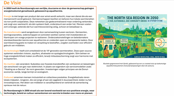 In 2050 heeft de Noordzeeregio een eerlijke, duurzame en door de gemeenschap gedragen energietoekomst gerealiseerd, gebaseerd op aquathermie.