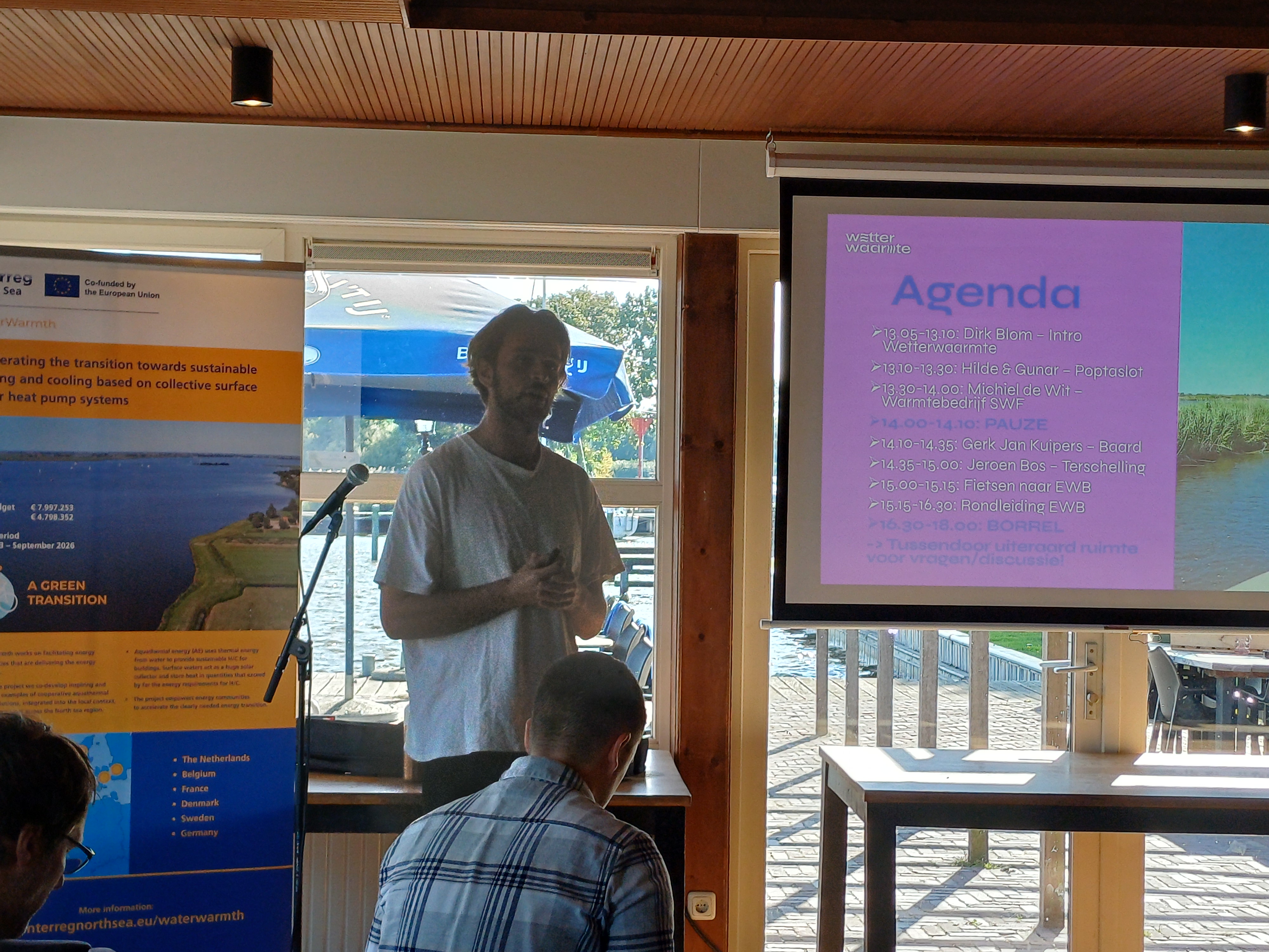 Jeroen Bos (gemeente Terschelling) presenteerde het project in West-Terschelling, dat de potentie van zeewater-aquathermie (ZLT-net) onderzoekt. Hoewel de technische mogelijkheden aanwezig zijn, vormt de financiële haalbaarheid op dit moment een te grote uitdaging. Het heeft alles te maken met onderliggende rekenmodellen en de looptijd van investeringen.