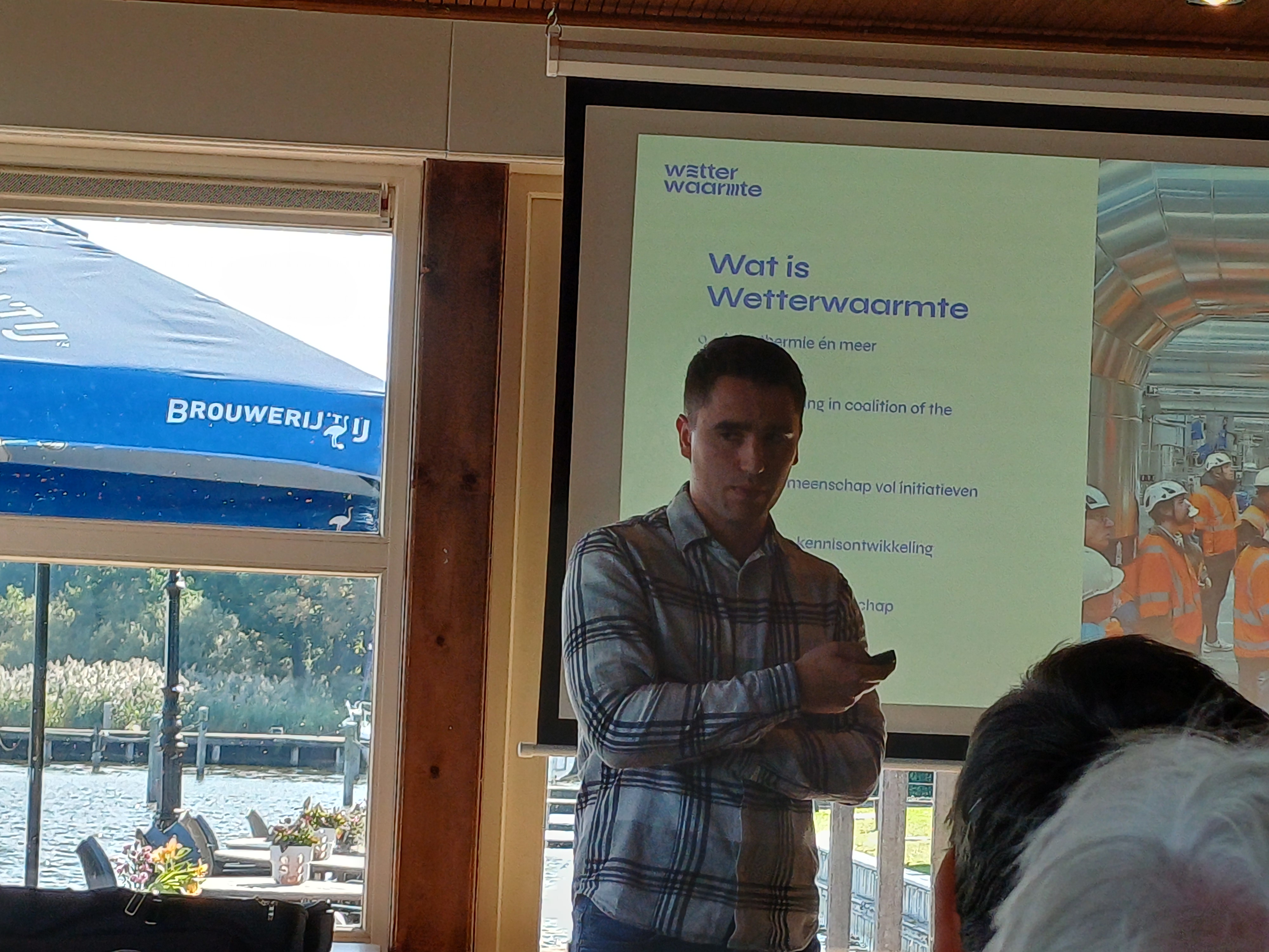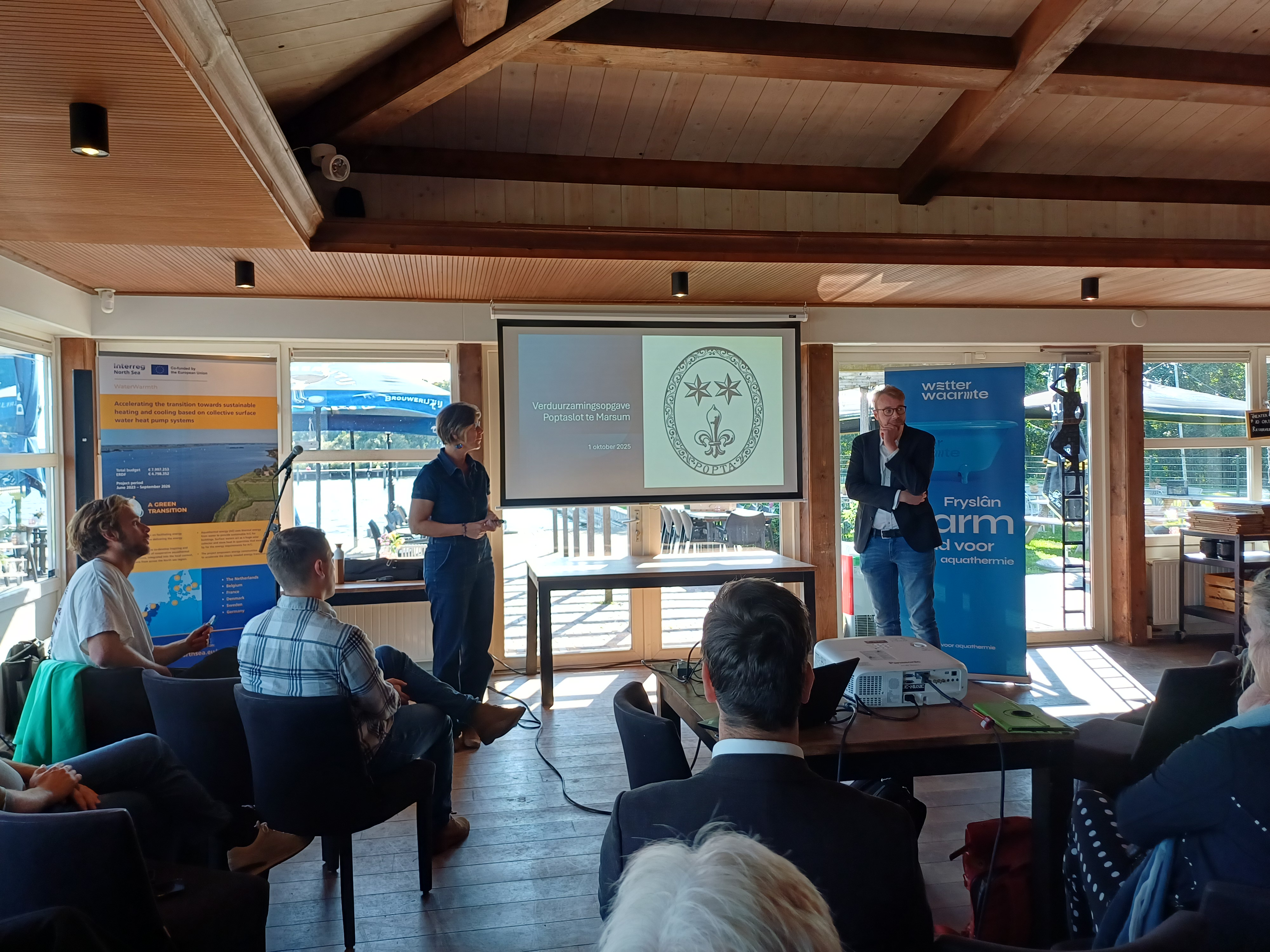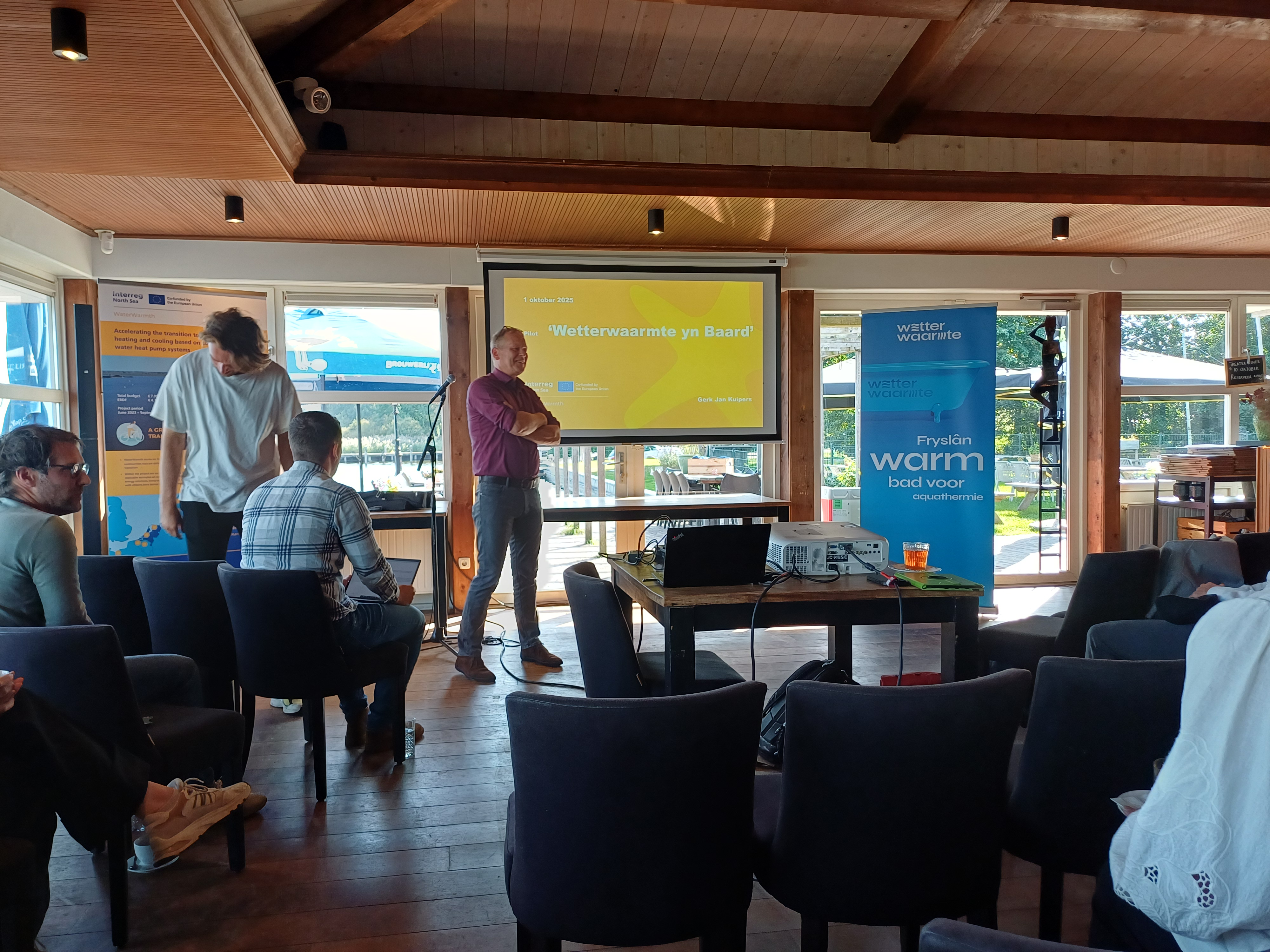 Gilles de Groot (Waterprof) de gespreksleider, presentaties kwamen van Dirk Blom (projectleider Wetterwaarmte), Hilde van Werven en Gunnar Boon (Poptaslot), Michiel de Wit (gemeente Súdwest-Fryslân), Gerk-Jan Kuipers (gemeente Leeuwarden), Jeroen Bos (gemeente Terschelling), Goffe Venema (Eigen warmte Balk) Yep Tiemensma (Dynhus) AVK Plastics (restwarmteleverancier) Publiek: bestuurders in Fryslân en betrokkenen bij Wetterwaarmte